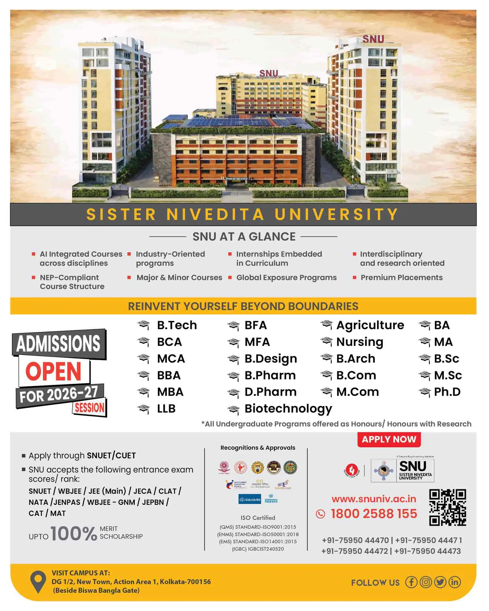 Sister Nivedita University (SNU) at New Town, Kolkata has been established through enactment of The Sister Nivedita University Act, 2017 (West Bengal XLIX of 2017). SNU, being unique of its own kind is built on the path of Sister Nivedita, blessed under the shadow of Swami Vivekananda. The university offers educational programs and research in a wide array of subjects, under disciplines like Engineering and Technology, Science, Medicine, Management, Law, Humanities, Language and Literature, Pharmacy, Architecture, Social Sciences, Performing Arts, Sports, Media, Design, etc. Moreover, some unique courses will be introduced with the emphasis on skill development, entrepreneurship and women empowerment.
